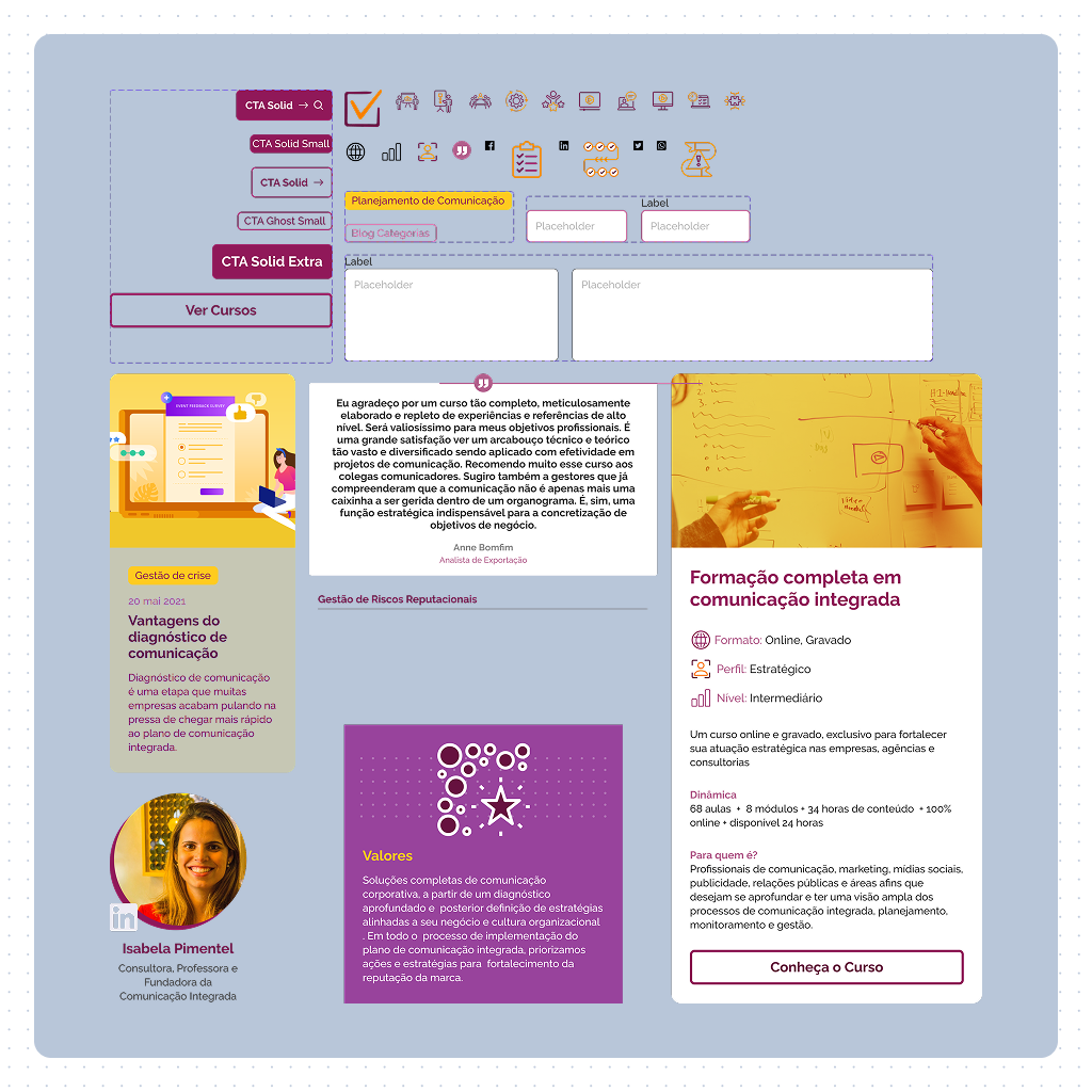A solução foi conduzida em três frentes integradas: 1. Reestruturação da informação - Reorganização completa da arquitetura de conteúdo - Definição de navegação orientada à encontrabilidade - Normalização de páginas, categorias e links 2. Alinhamento semiótico (confiança do cliente) - Criação de moodboard estratégico - Definição de direção visual baseada no branding existente - Uso da estética como ferramenta de validação e adesão → Ponto de virada: desbloqueio da colaboração ativa da cliente 3. Implementação orientada a sistema - UI estruturada com consistência entre páginas - Front-end estático (Gatsby) - Integração com WordPress como CMS desacoplado - Suporte a SEO e tracking com marketing